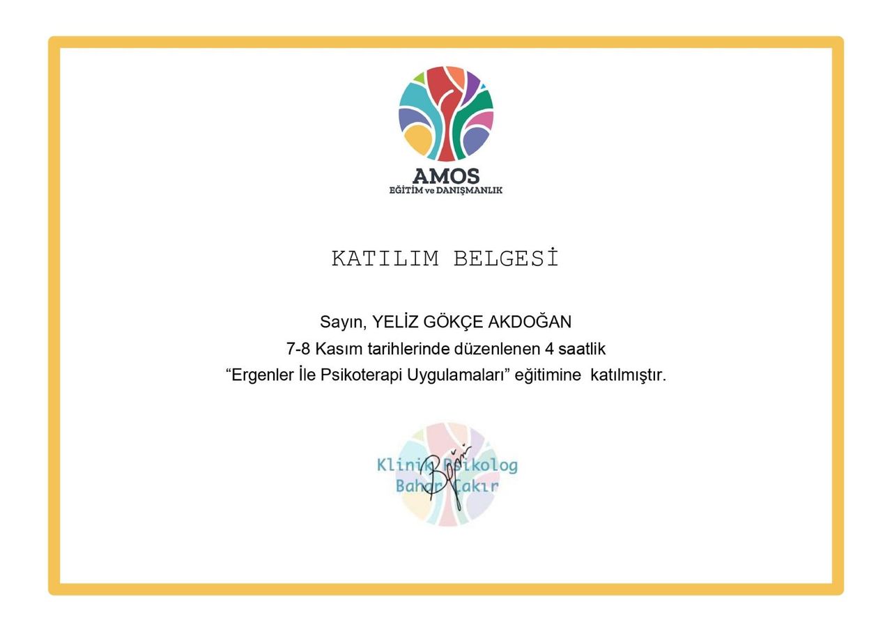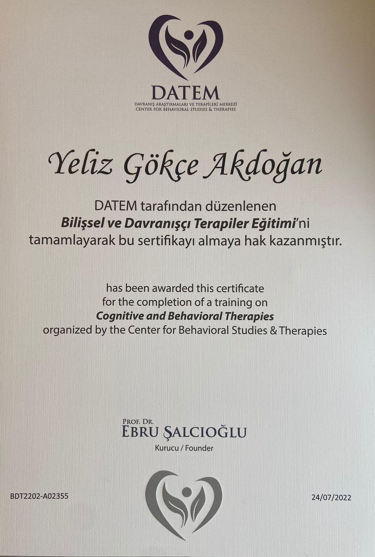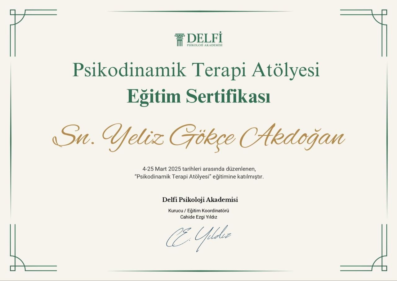 Çocuk ergen ve yetişkin BDT eğitimlerimin yanı sıra yüksek lisans eğitimim boyunca dersler aldığım Prof. Dr. Doğan Şahin’in Psikodinamik Psikoterapi Temel Eğitimi doğrultusunda psikodinamik ekolde çalışma hayatıma devam etmekteyim.